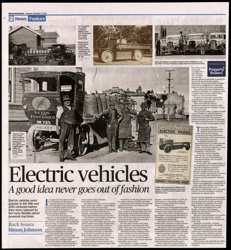 Local historians weekly "Back Issues" article in the Manawatū Standard. Electric vehicles were popular in the 19th and early 20th centuries before they were replaced by more flexible petrol powered machines. The Rongotea Co-op Dairy Company used Chicago built Walker electric trucks from 1917 to 1935. The council also used and promoted electrically powered vehicles from the 1920s to the mid 1930s.