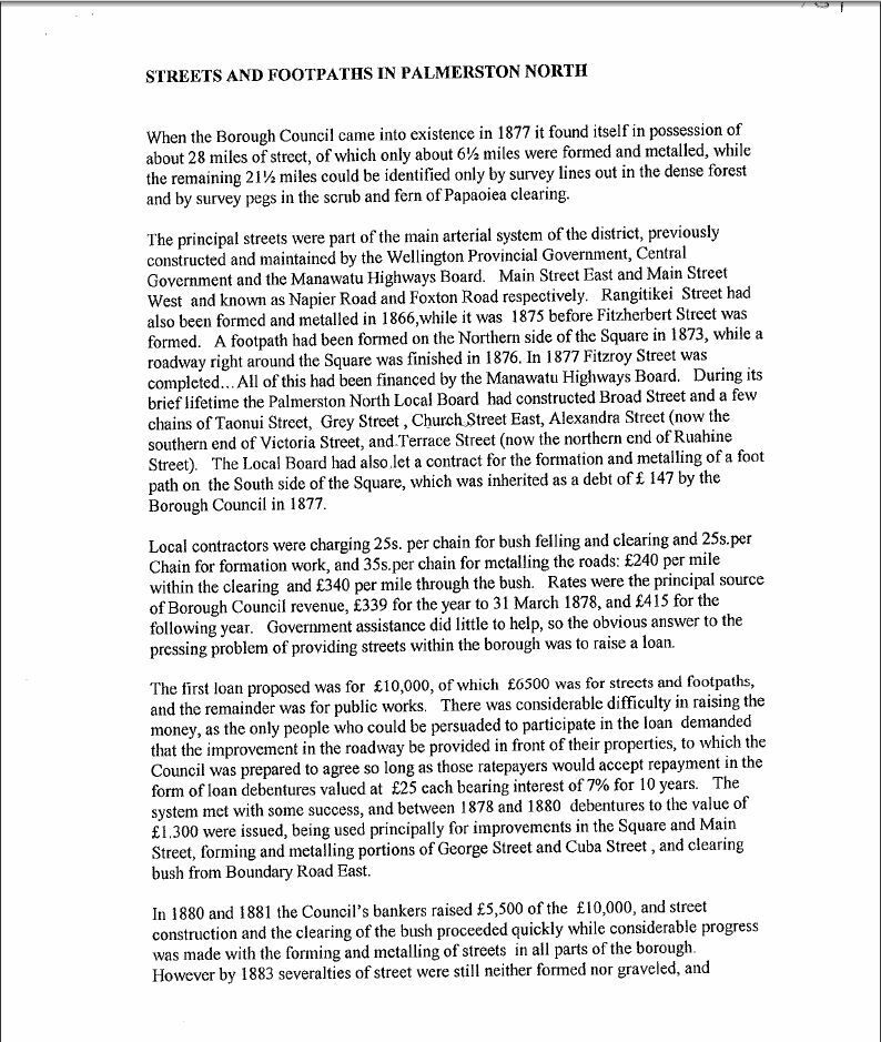 This documents details how roading amenities were developed in the early days of the borough of Palmerston.