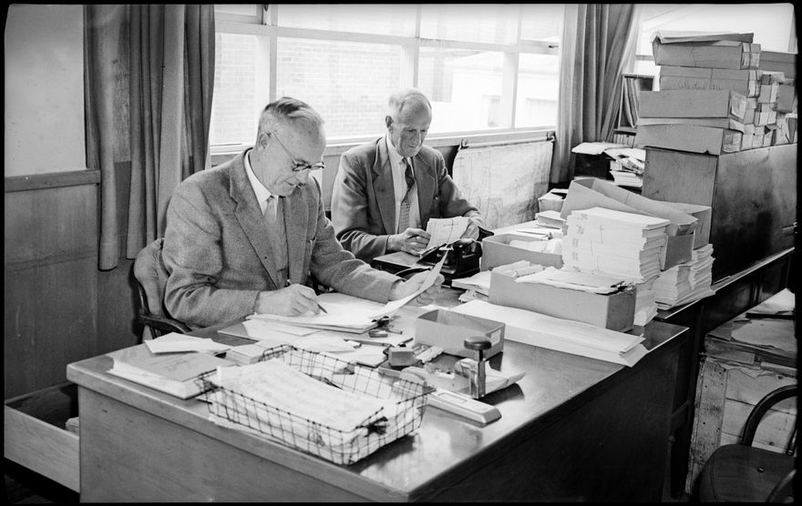 This image was taken for a story that ran in The Manawatu Evening Standard on 23 November 1960 "Shown at their desks are the Deputy-Returning Officers at the Courthouse whose duty at present is issuing special votes to the public who will be unable to vote on Saturday. Nearest the camera is Mr. J. Dilks and on his left is Mr. F. Howard."