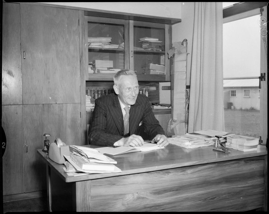 This image was taken for a story that ran in The Manawatu Evening Standard on 19 February 1958, page 8: "Mr. L. Morine, who has taught in Palmerston North schools for many years, and who will be retiring at the end of the present term. At present he is the headmaster of the Roslyn School."