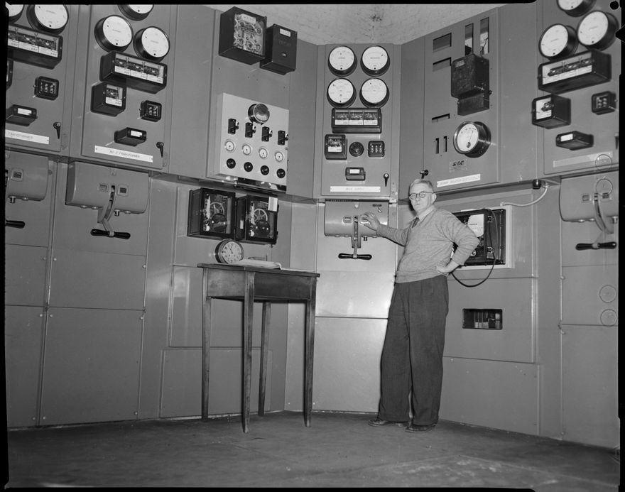 This image was taken for a story that ran in The Manawatu Evening Standard on 23 May 1958, page 8: "Mr. Black-out" prepares to plunge the city into darkness, the water heaters into coolers and the public into gloom -- unless … Here at the City Council sub-station, a technician illustrated just what will happen next week when more severe cuts will be introduced unless there is an immediate response to the electricity department's appeal for greater voluntary savings in the use of electric power. The reduced consumption has been ordered by the State Hydro-Electric Department, and local bodies have no option but to comply. Whether or not "Mr. Black-out" goes into action will depend on the individual efforts of citizens."