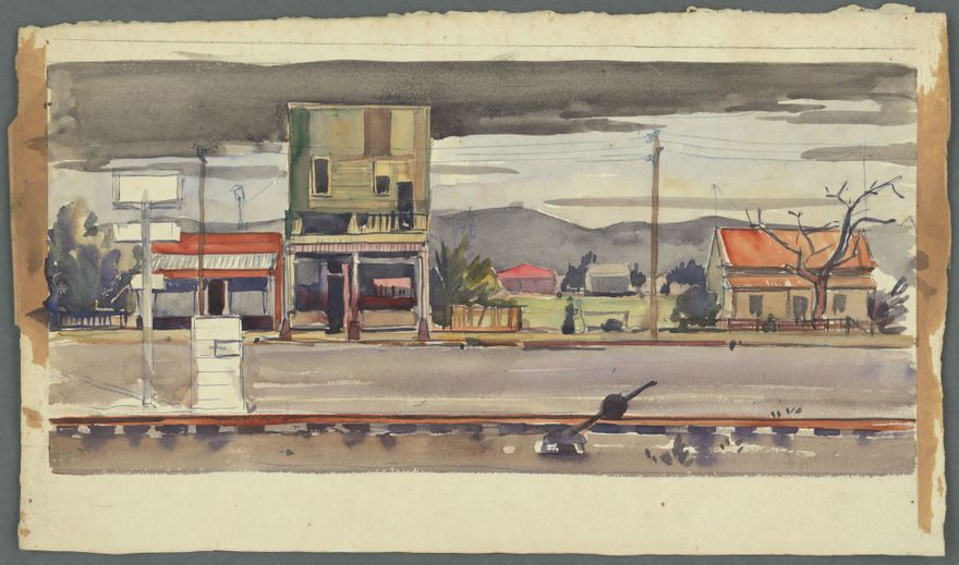 Painting, looking across the railway lines to buildings on Main Street east, near the corner of Victoria Avenue, Palmerston North. Pen and wash. Colour. John Tetley was a parasitologist at Massey Agricultural College and a well known amateur artist who exhibited locally.