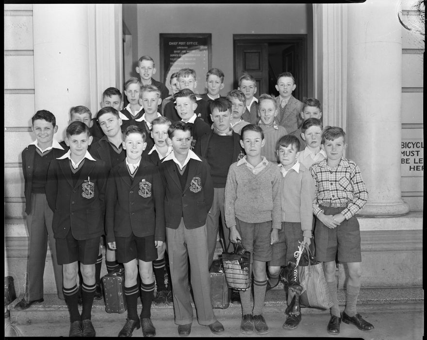 This image was taken for a story that ran in The Manawatu Evening Standard on 06 September 1958: "Junior Rugby players from several city schools left this morning by transport supplied by the public to play in a Wellington tournament. They are seen at the Palmerston North Post Office prior to departing."