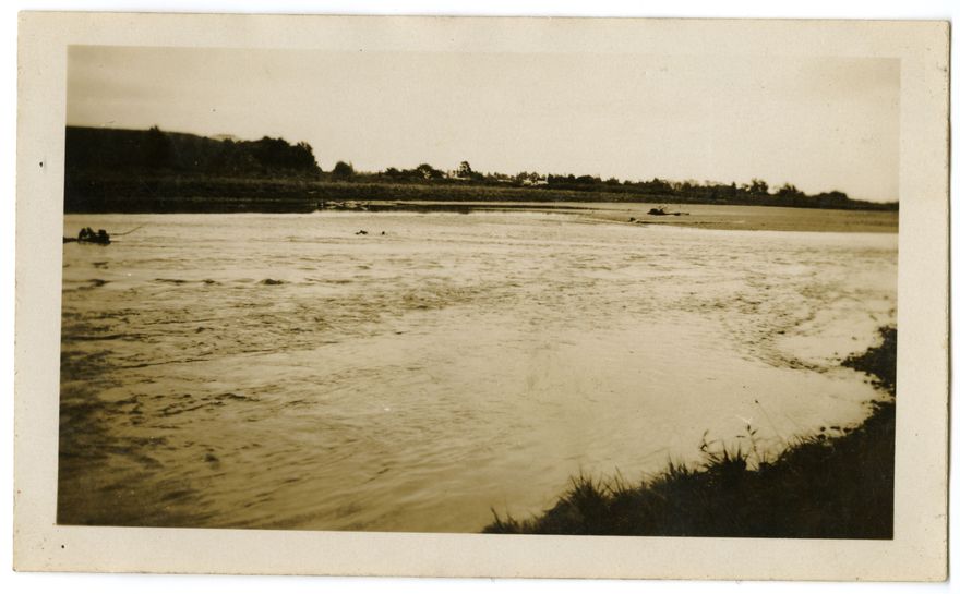 - This photograph came from a small photograph album that belonged to Mrs R Andrews of Rangitikei House. This photograph has no caption, but is on the same page as photographs of a picnic in Ashhurst, which could indicate that this photograph shows the Manawatu River near there. See CA: Andrews Collection