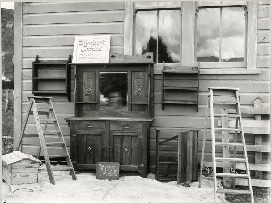 This photograph shows the handiwork of students under Mr Stephenson. Some of the items pictured are ladders, a cabinet and sets of shelves. The photographer, Charles Wildbore, was a well known local, amateur photographer during the early years of the 20th century. See the 75th Jubilee Booklet of the Pohangina and Mt Richards School (1963) for a brief history of the Technical School.